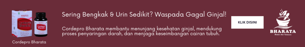 Rekomendasi SolusiDokter: Untuk mendukung kesehatan ginjal, Anda dapat mempertimbangkan Cordepro Bharata, suplemen herbal dengan kombinasi ekstrak Andrographis Paniculata, Centella Asiatica dll. Secara tradisional, formulasi ini dikenal membantu menjaga fungsi ginjal, mendukung detoksifikasi, dan memperkuat daya tahan tubuh.